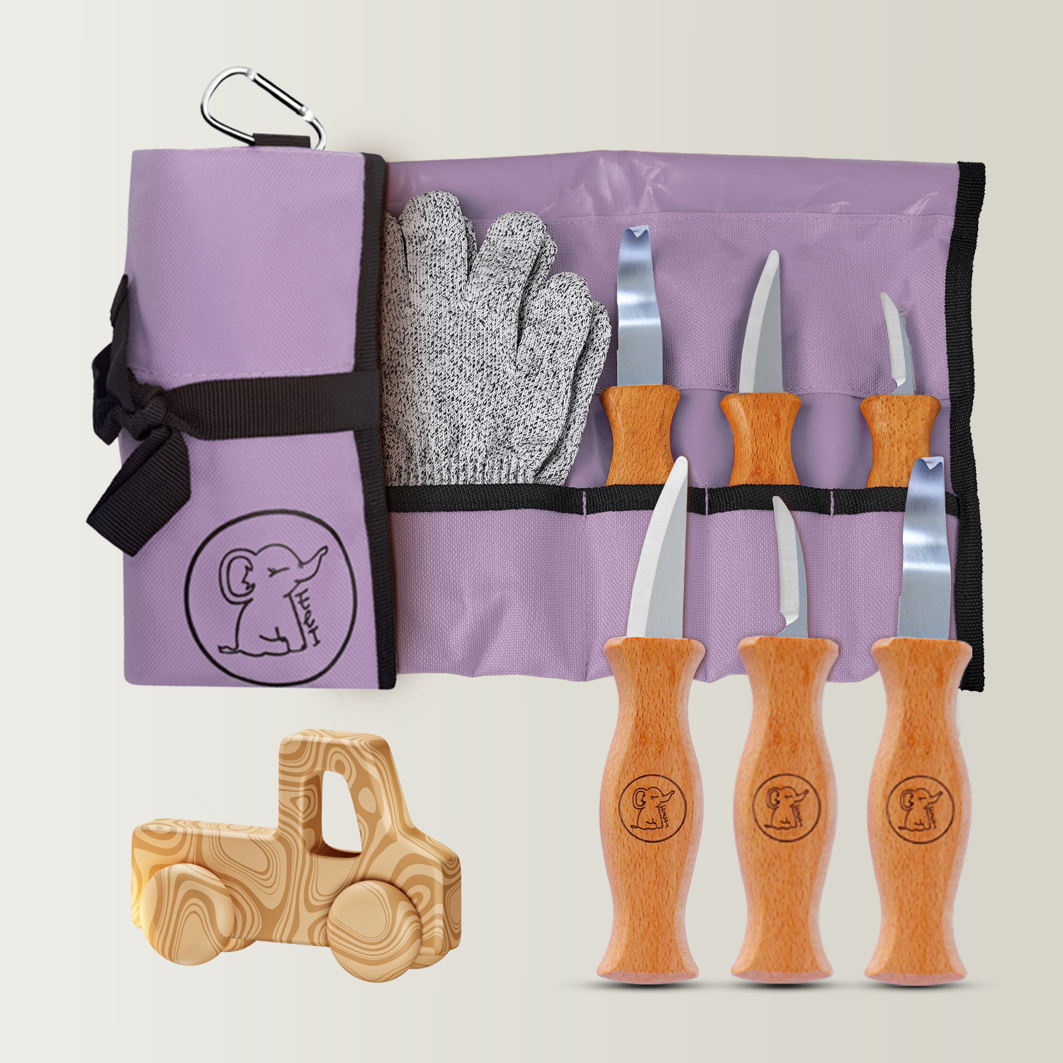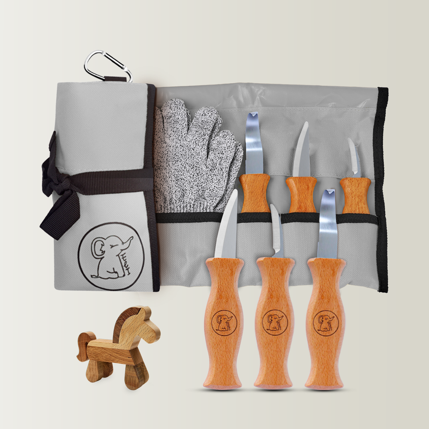 Schnitzset aus 3 Messern, Handschuhen und gelber Tasche