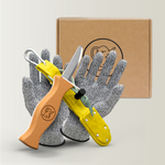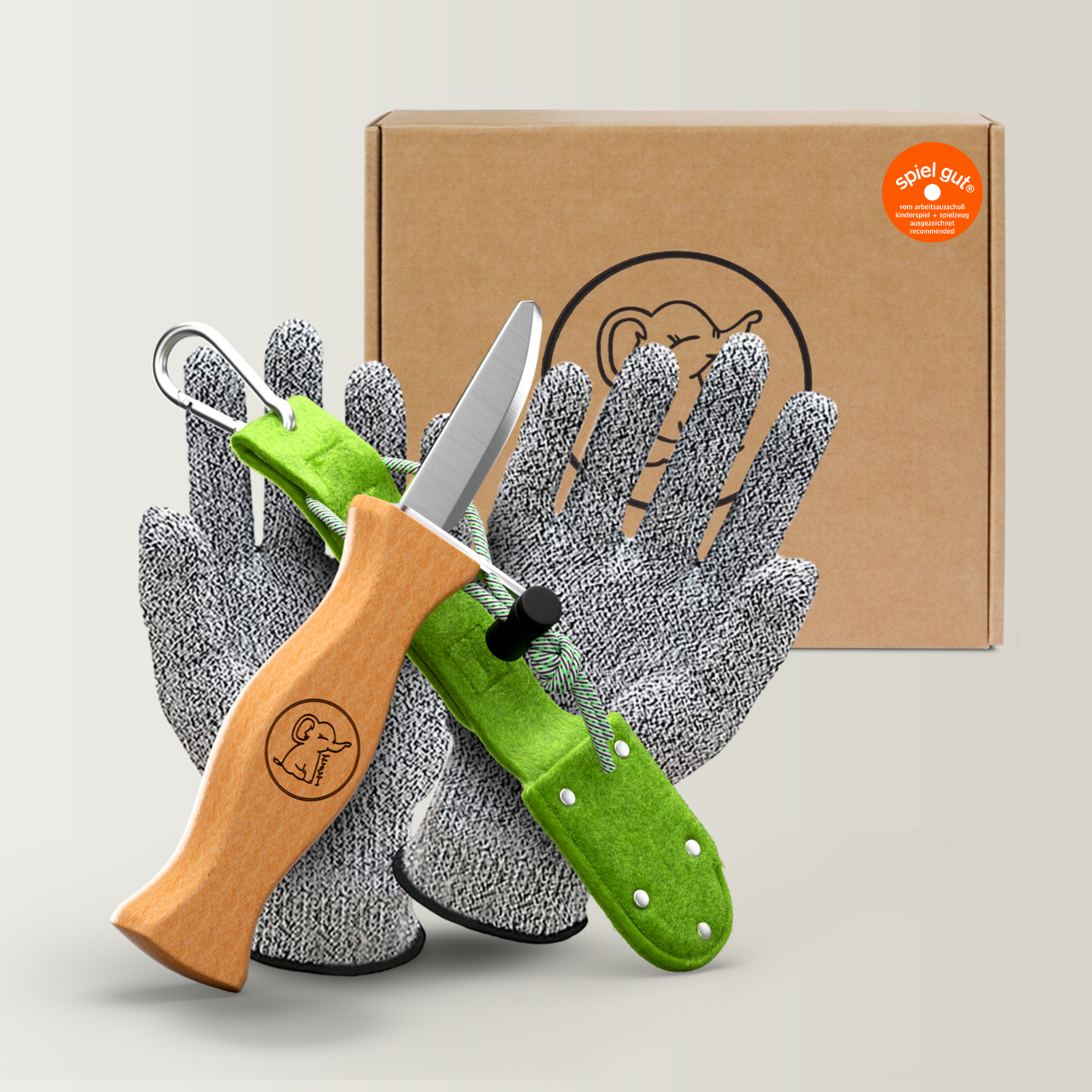 Kinderschnitzmesser mit grauer Filztasche und Handschuhen