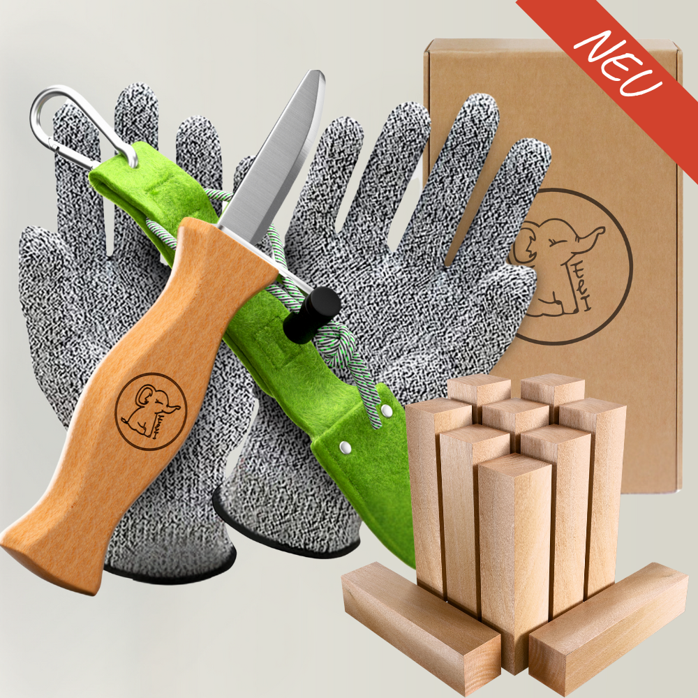 Kinderschnitzmesser mit grüner Filztasche und Handschuhen