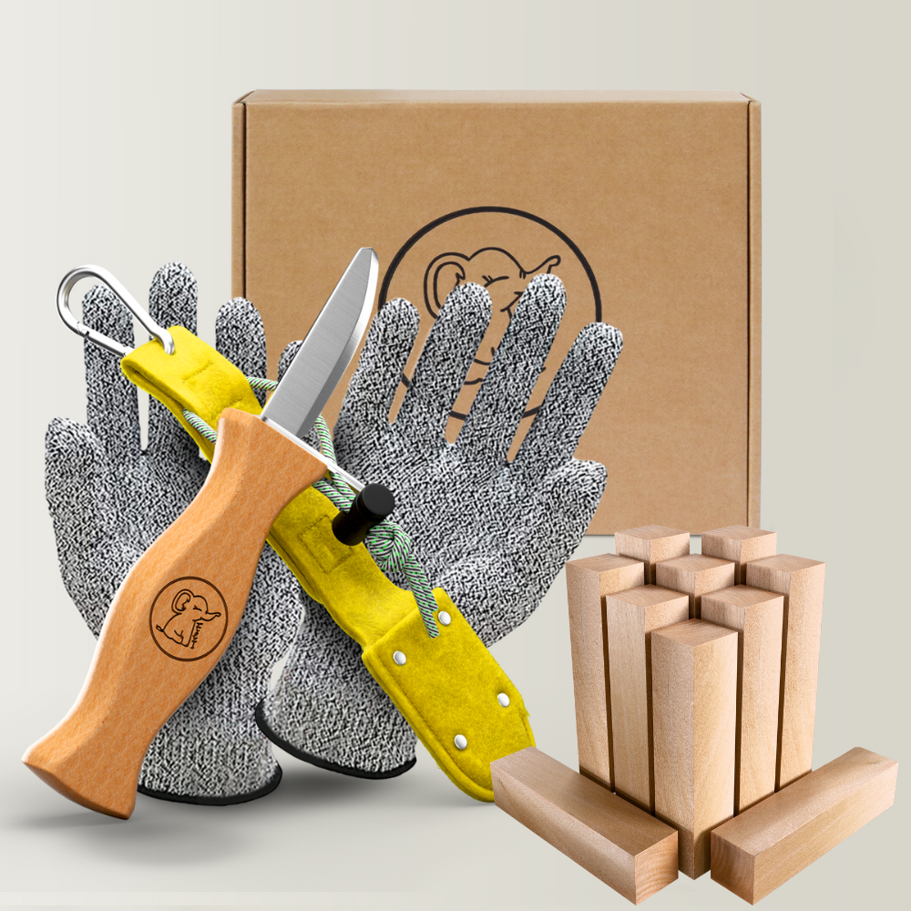 Kinderschnitzmesser mit gelber Filztasche und Handschuhen