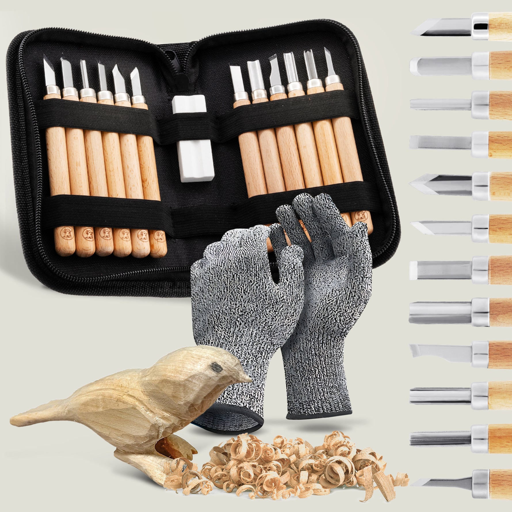 Schnitzmesser Kinder mit 12 Werkzeugen - Handschuhe - Schleifstein