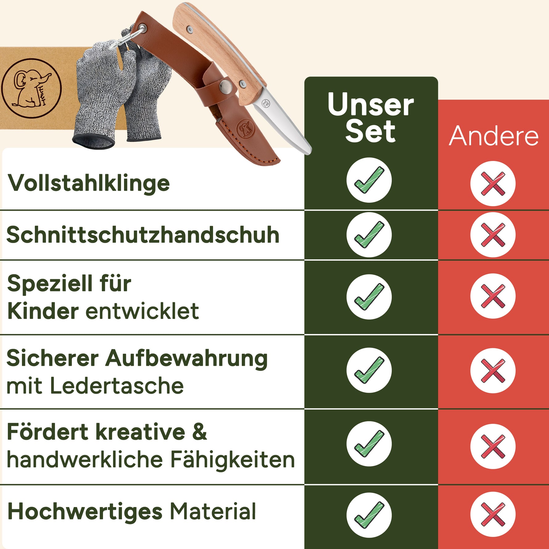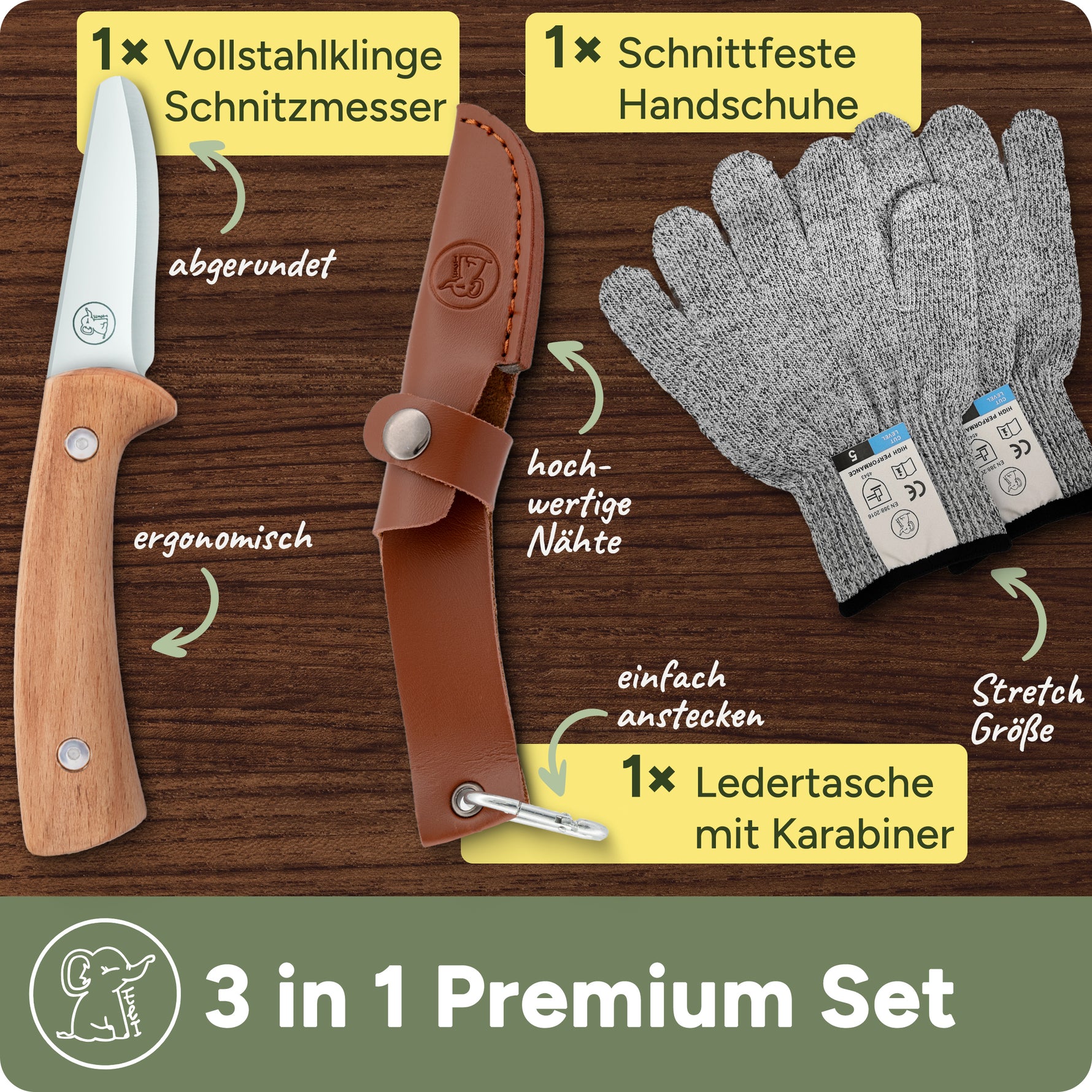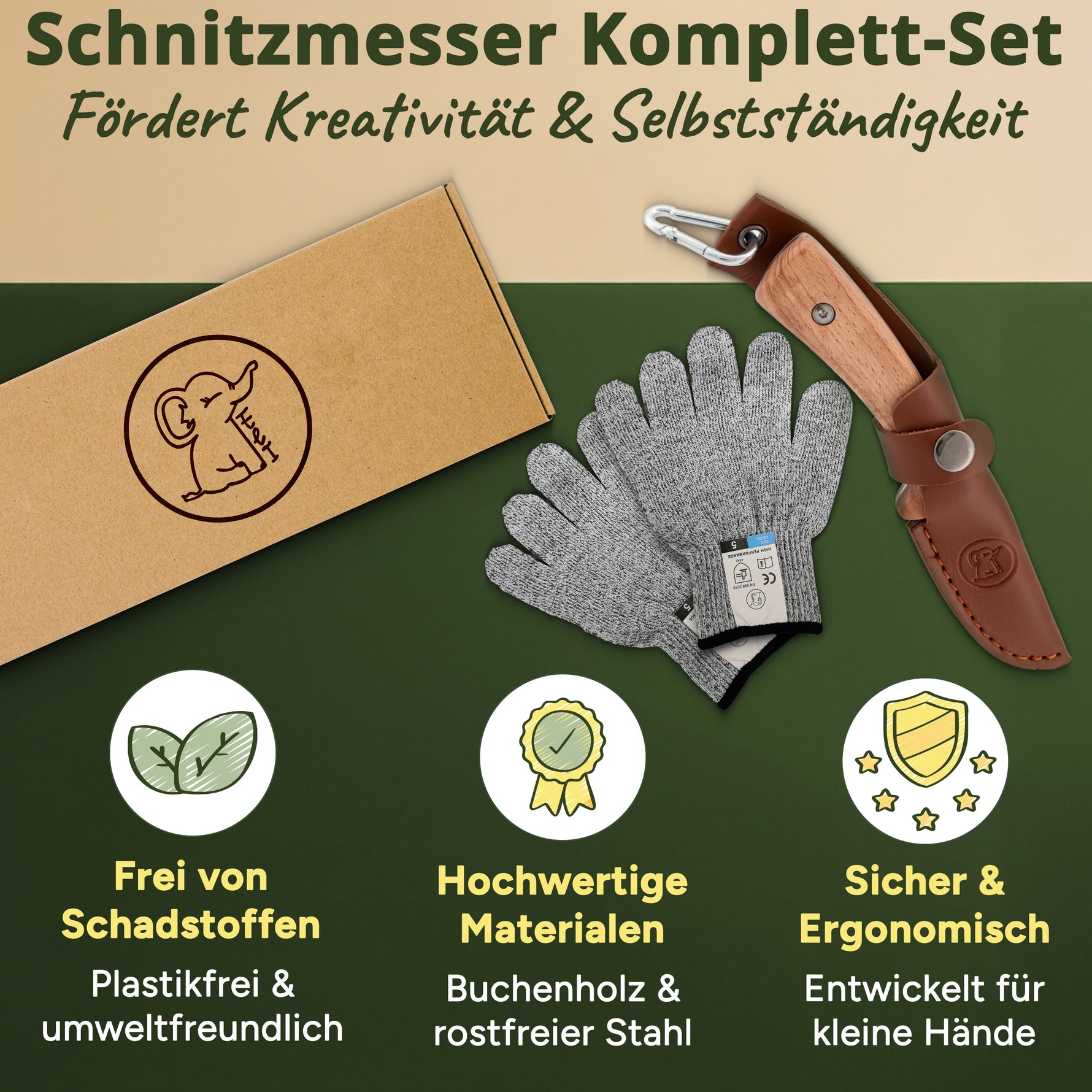 Schnitzmesser inkl. Schnitzholz - Handschuhen und Ledertasche